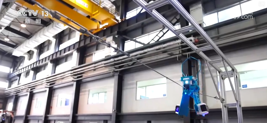 在模拟的超高压输电线路上方,一场特殊的“高空芭蕾”正在进行。一台地线除冰机器人正在演示覆冰导线上作业,启动除冰程序。
