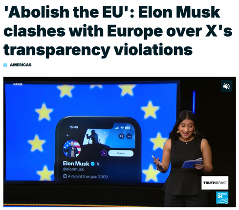 △“法国24”电视台称,针对欧委会罚单,马斯克在互联网上掀起了堪称疯狂的舆论风暴,发表了一系列攻击欧盟的言论