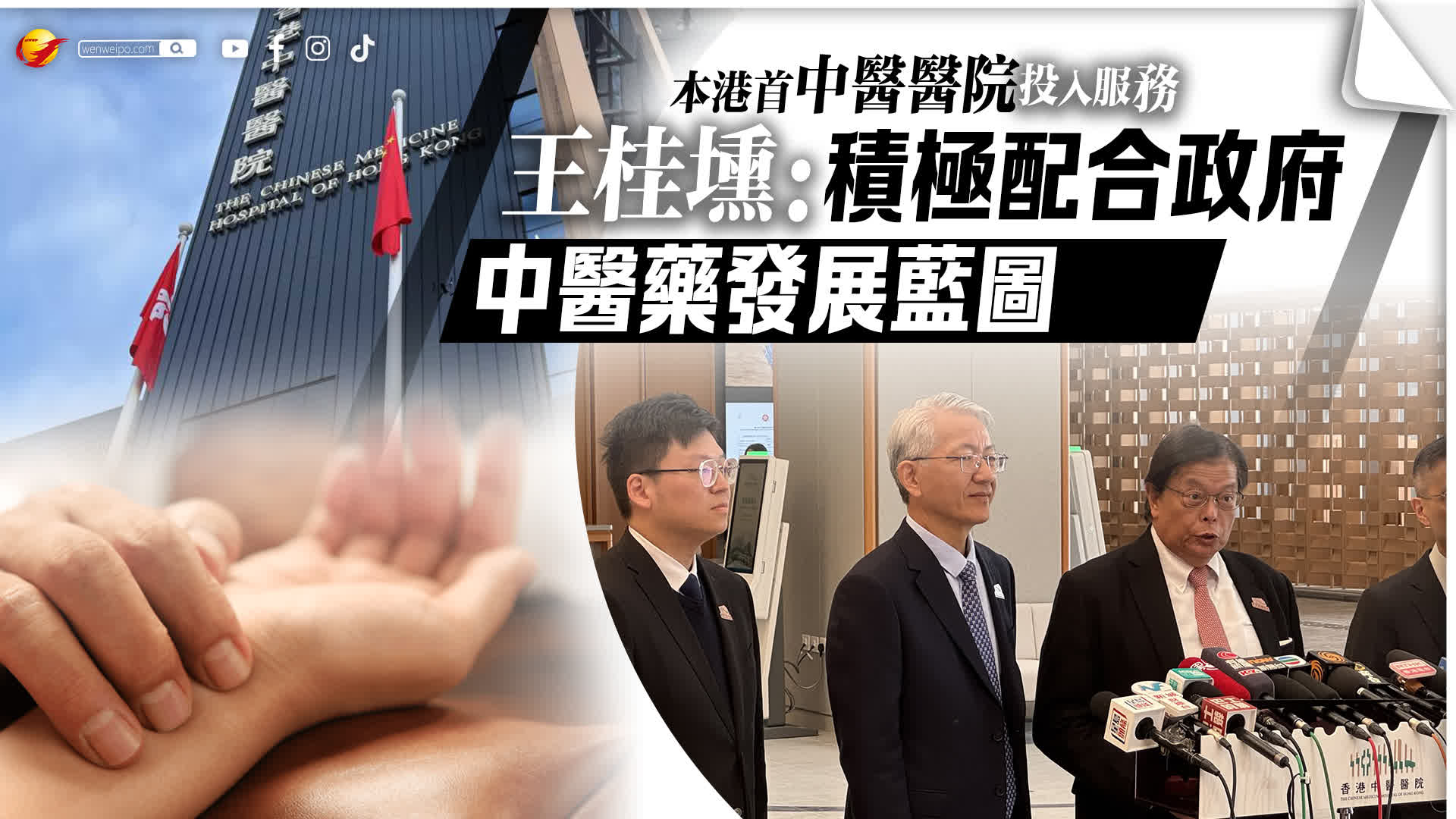 香港中醫醫院今日(11日)起分階段投入服務。醫務衞生局中醫醫院發展計劃辦事處總監張偉麟、香港中醫醫院營運機構董事局主席王桂壎、香港中醫醫院行政總監卞兆祥和香港中醫醫院副行政總監(中醫)張振海今日主持記者會,介紹香港中醫醫院服務安排詳情。