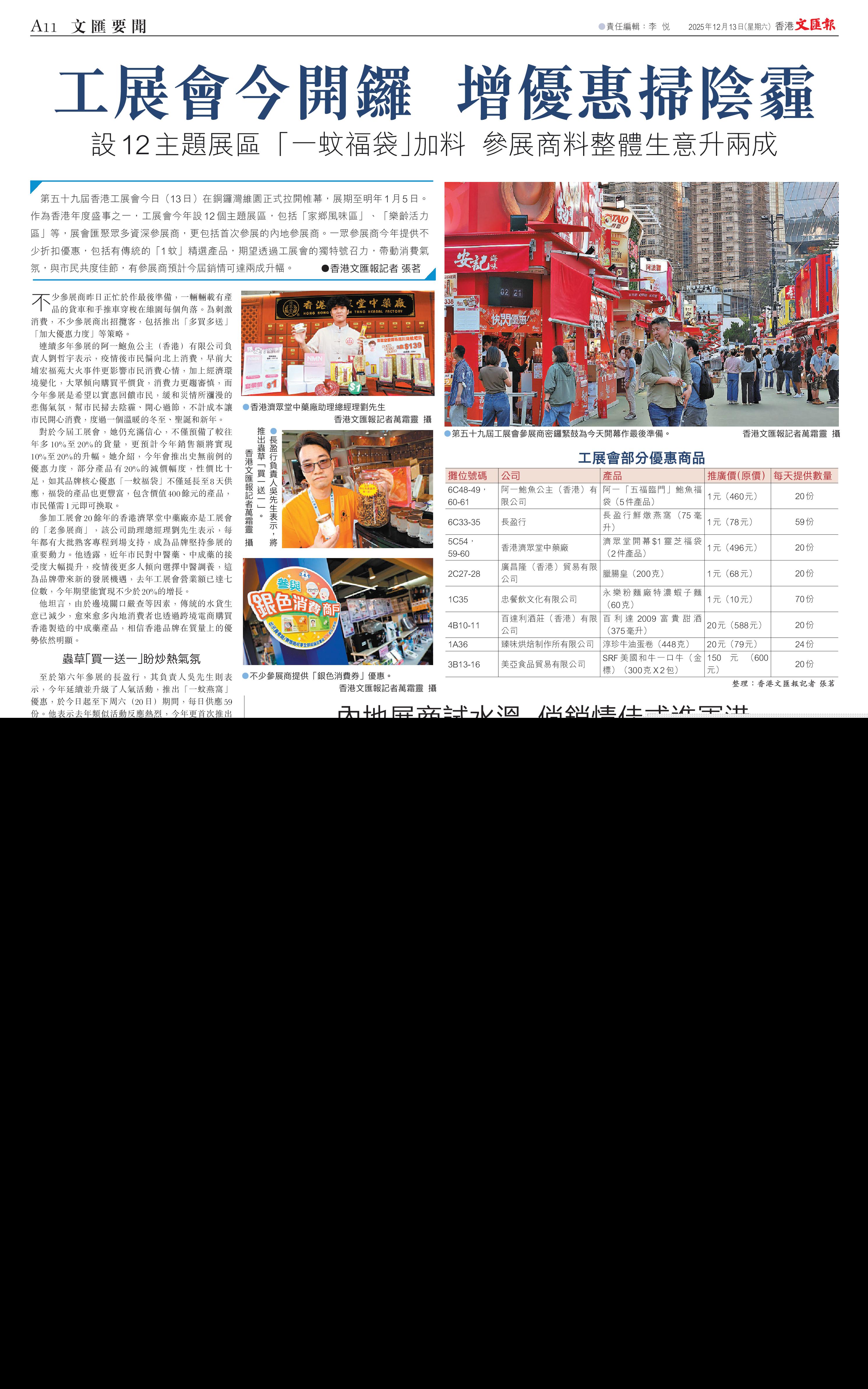 至於第六年參展的長盈行,其負責人吳先生則表示,今年延續並升級了人氣活動,推出「一蚊燕窩」優惠,於今日起至下周六(20日)期間,每日供應59份。他表示去年類似活動反應熱烈,今年更首次推出蟲草「買一送一」的重磅福利,期望以誠意帶動場內氣氛。