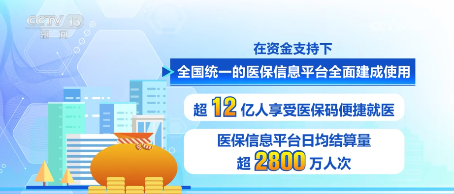 在资金支持下,全国统一的医保信息平台全面建成使用,超12亿人享受医保码便捷就医,医保信息平台日均结算量超2800万人次。