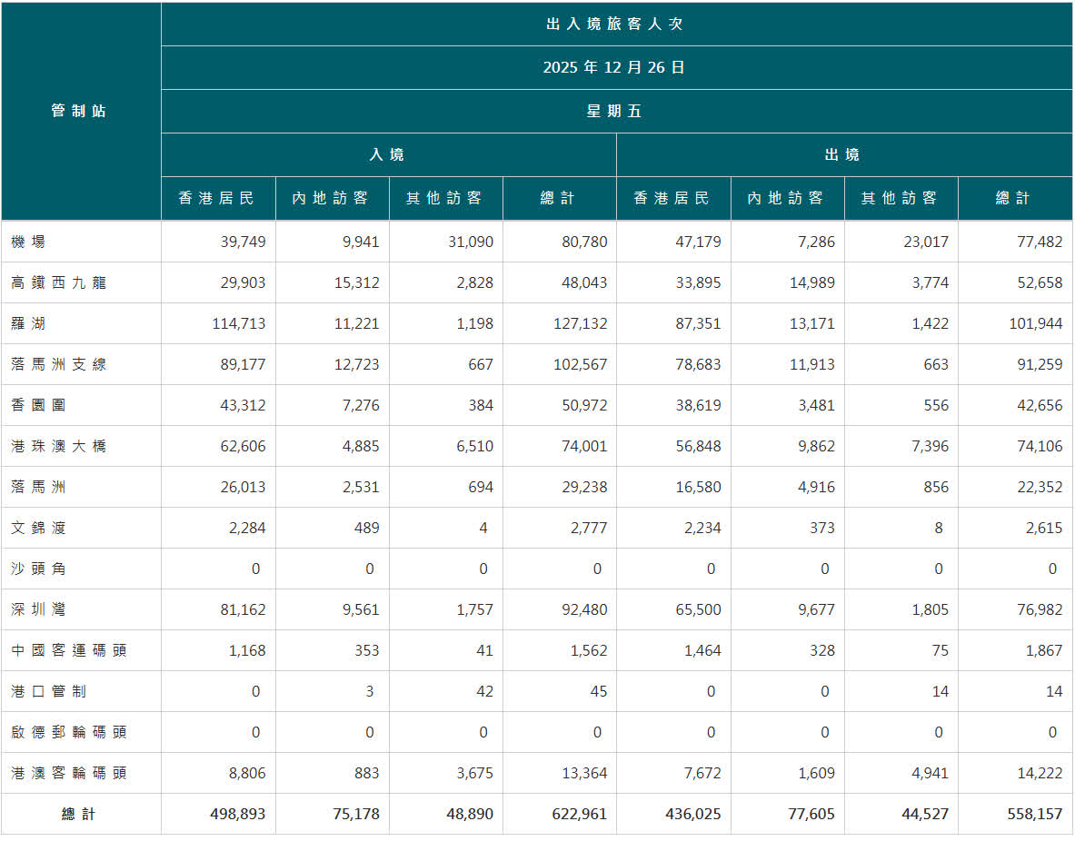 聖誕節小長假第二天,根據入境處數字,昨日共有超過118萬1千人次經各管制站出入境,包括62萬2千多人次入境,及55萬8千多人次出境。