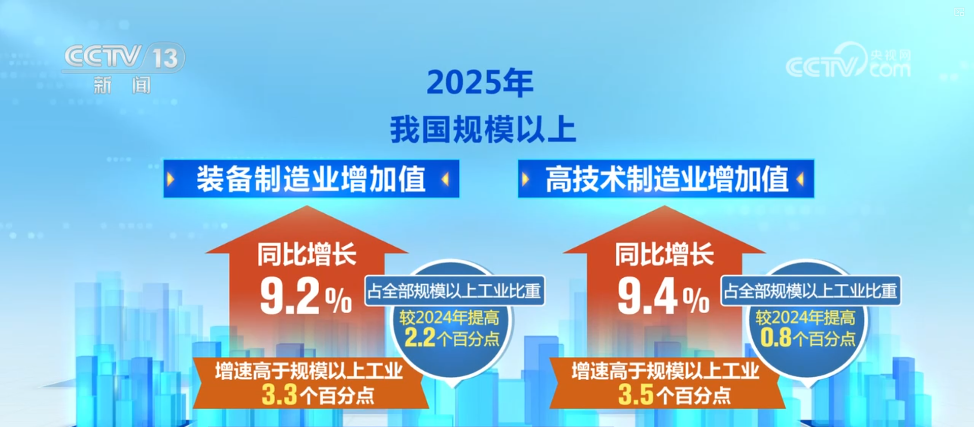 数据显示,2025年,我国规模以上装备制造业、高技术制造业增加值同比分别增长9.2%、9.4%,增速高于规模以上工业3.3个、3.5个百分点,占全部规模以上工业比重较2024年提高2.2个、0.8个百分点;累计建成3.5万余家基础级、8200余家先进级、500余家卓越级、15家领航级智能工厂,累计培育国家绿色工厂超8000家。