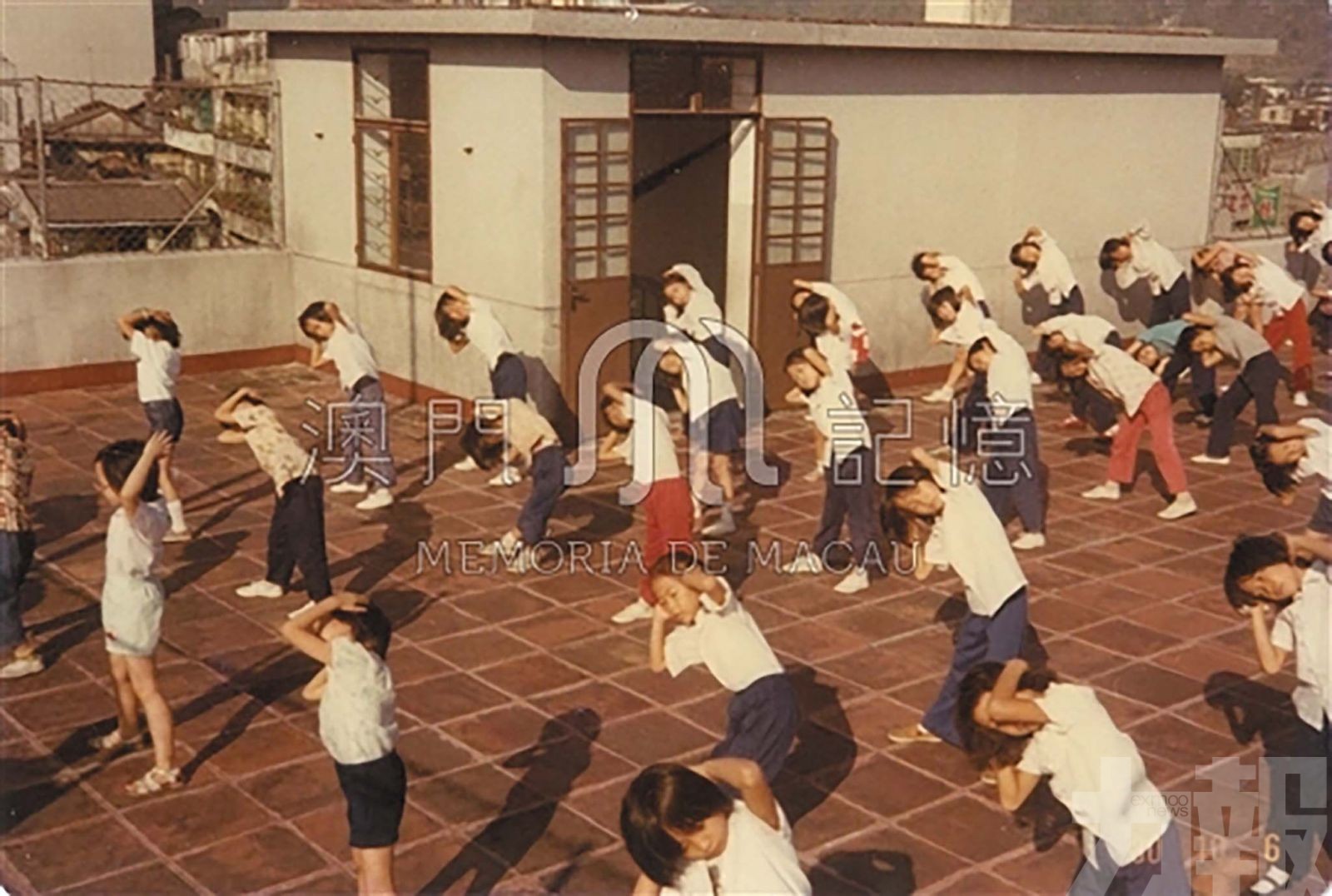 同善堂小學學生在天台做運動。(同善堂提供,摘自「澳門記憶」文史網)