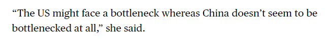 文章同时提到,相比之下,美国在几十年前电力需求似乎趋于平稳后,新增装机速度一直较慢。如今,随着人工智能的迅猛发展,美国正艰难应对数据中心等高耗能行业的电力需求,导致电力市场极为紧张。文章援引业内人士的话说:“美国可能会面临瓶颈,而中国似乎完全没有瓶颈。”