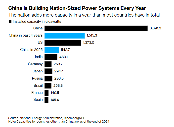 文章援引中国国家能源局日前公布的数据,2025年,中国各类技术新增发电装机容量达到543吉瓦(GW)。这一数字比截至2024年底印度全国所有发电厂的总容量还要高出12%。自2021年底以来,中国新增的发电容量也已超过整个美国电力系统的总量。