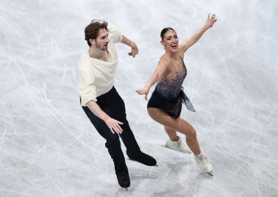 2025年12月5日,意大利组合孔蒂(右)/马奇在双人滑自由滑比赛中。当日,2025-2026赛季国际滑联世界花样滑冰大奖赛总决赛双人滑比赛在日本爱知县名古屋举行。最终,他们以223.28分的成绩获得双人滑银牌。新华社记者 岳晨星 摄