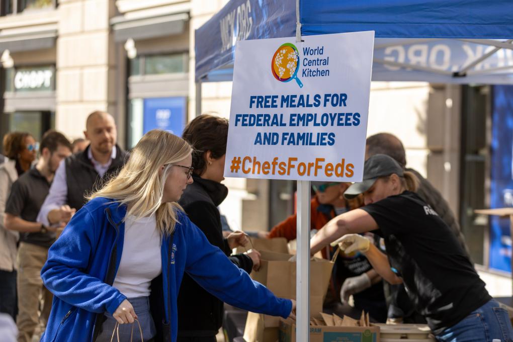 2025年11月5日,在美国首都华盛顿,联邦雇员排队领取免费食物。新华社记者胡友松摄