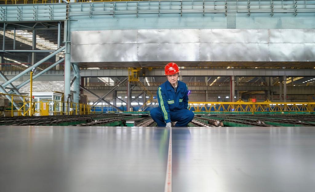 在山钢集团日照公司,工作人员对镍系钢进行表面质量检查和尺寸测量。(付睿璇 摄)