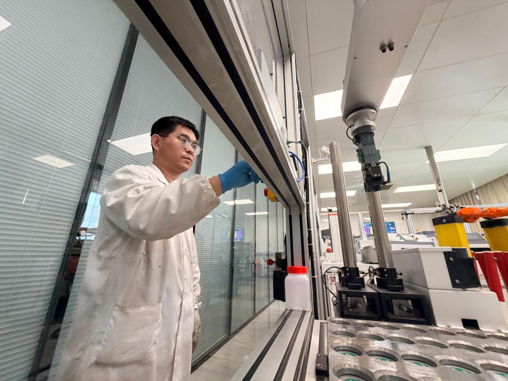 在日照钢铁控股集团,工作人员正对产品进行成分组织检测。新华社记者张钟仁 摄