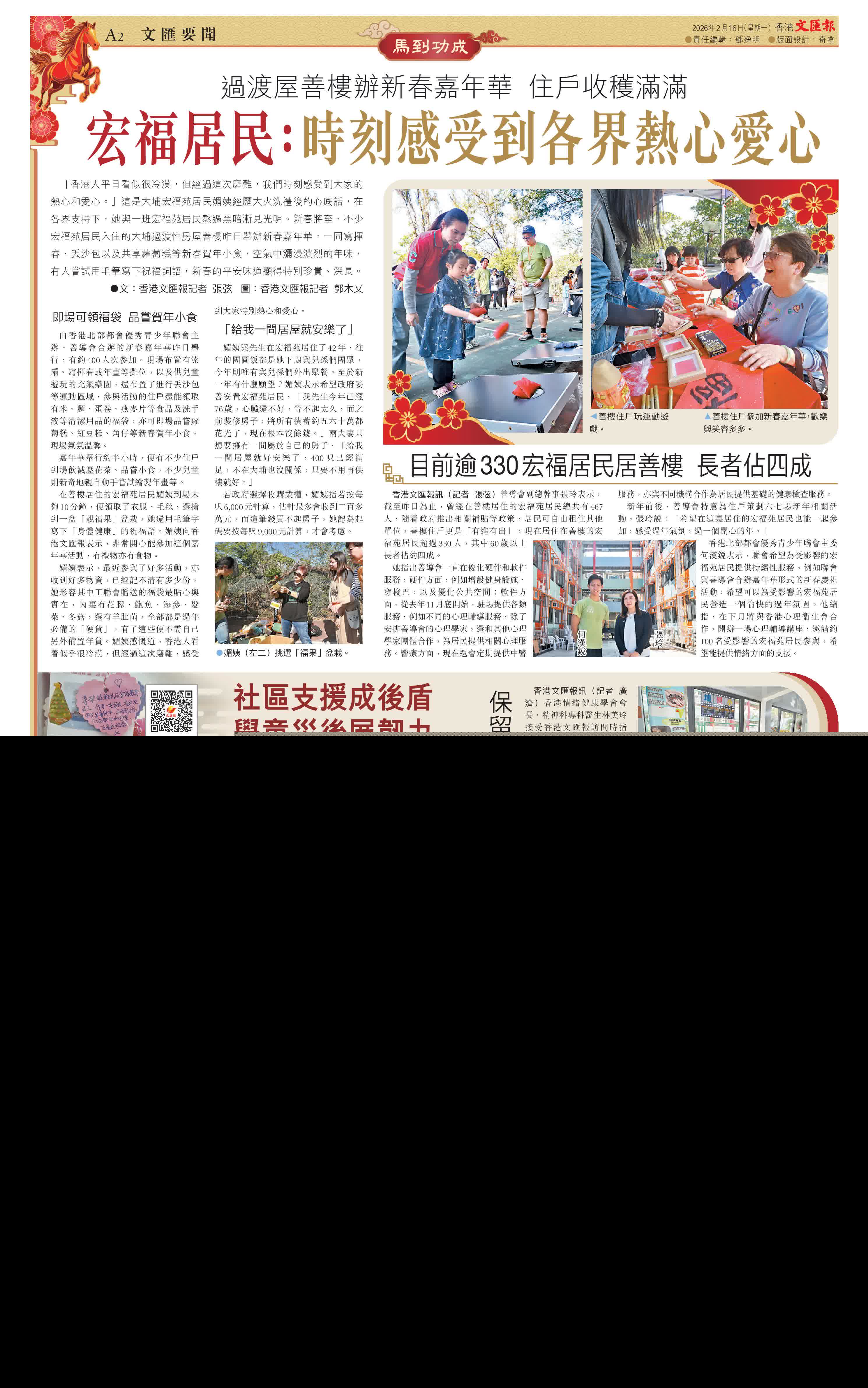 新年前後,善導會特意為住戶策劃六七場新年相關活動,張玲說:「希望在這裏居住的宏福苑居民也能一起參加,感受過年氣氛,過一個開心的年。」