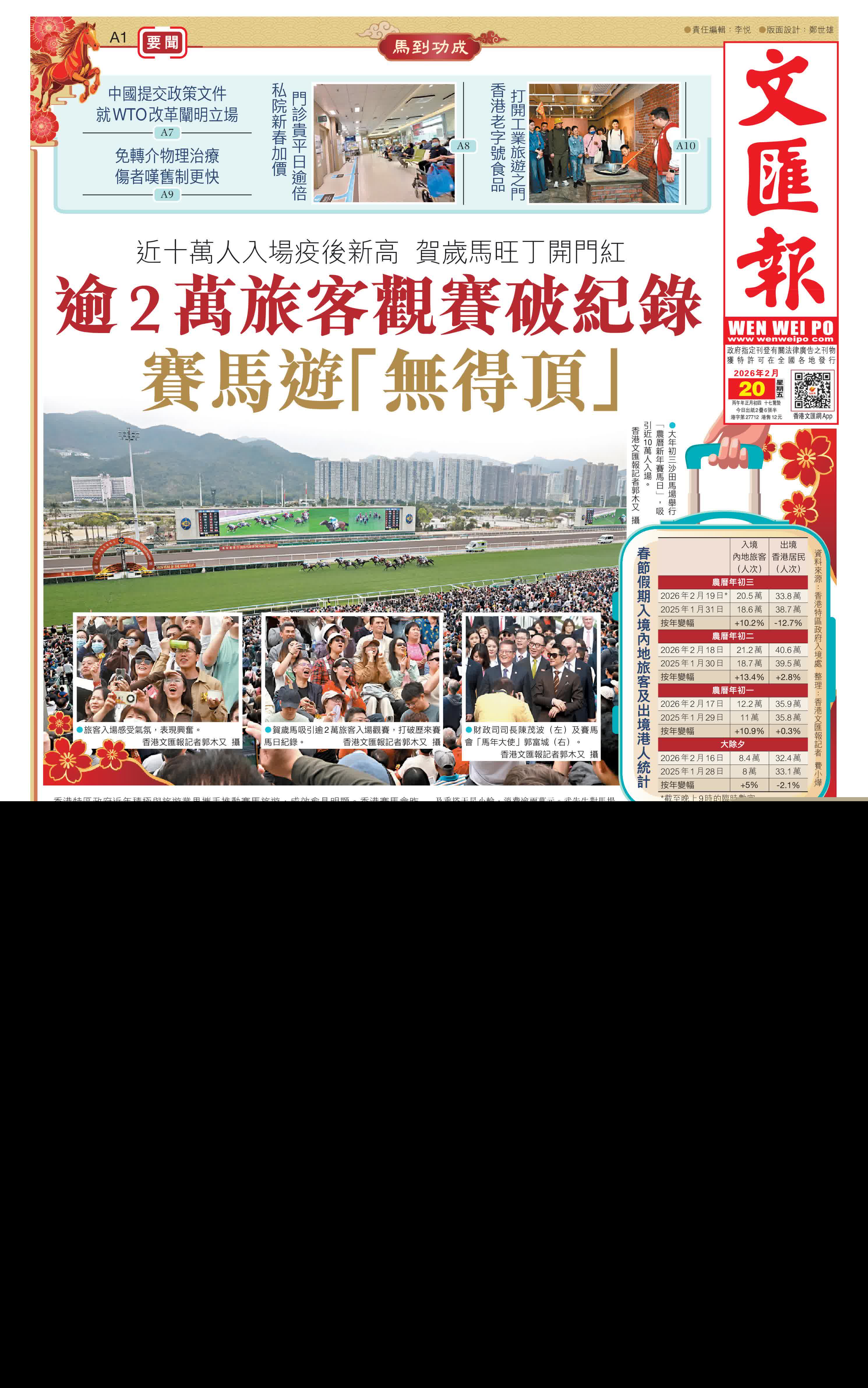 (香港文匯報記者 崔瀅)香港特區政府近年積極與旅遊業界攜手推動賽馬旅遊,成效愈見明顯。香港賽馬會昨日農曆大年初三按慣例在沙田馬場舉行「農曆新年賽馬日」,吸引逾9.8萬人入場,當中內地及海外旅客倍增至逾2萬人,刷新歷來賽馬日紀錄;全日11場賽事,共錄得逾18.4億元投注額。香港文匯報記者現場所見,場內四處皆可見到內地或外國旅客的身影,不少人大讚香港賽馬氣氛「無得頂」。馬會表示,2025/26年度馬季僅過一半已累積近21萬旅客人次入場,超越上季全季總數19.5萬人次,充分展現賽馬旅遊的獨特吸引力。為賽事主持開幕儀式的香港特區政府財政司司長陳茂波亦在社交平台發文表示:在今年馬年效應下,沙田馬場賀歲賽事更熱鬧,入場人次創疫後新高!
