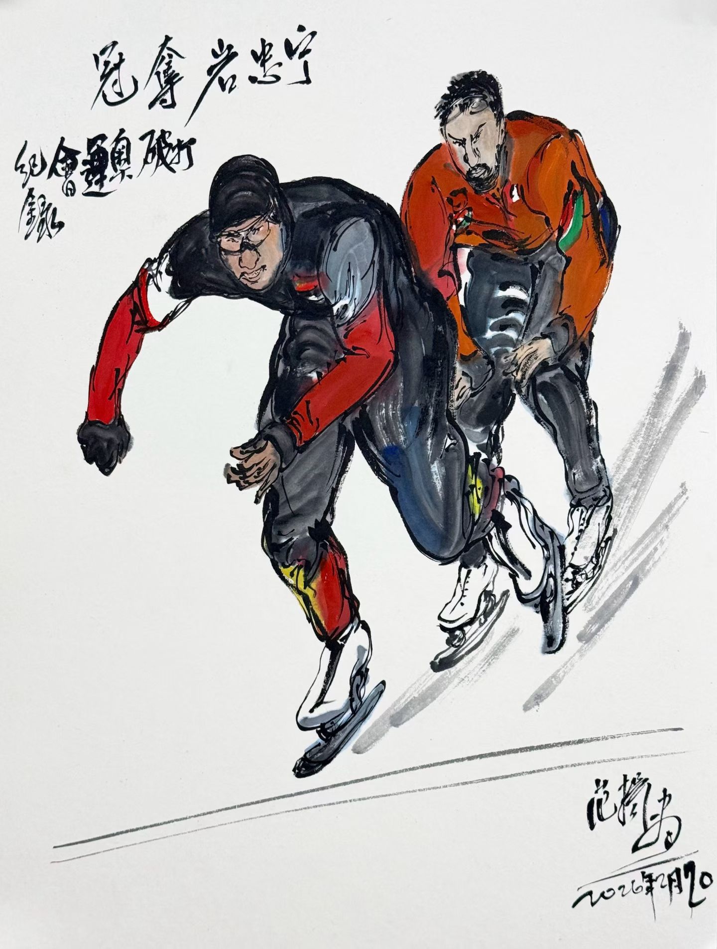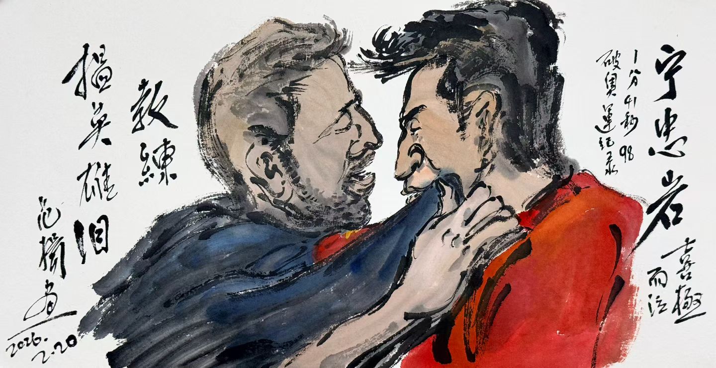 著名书画家范扬先生闻风而动,立即将央视直播画面的精彩瞬间写于笔端。宁忠岩冲刺刹那、喜极而泣等时刻被艺术而传神地一一呈现。