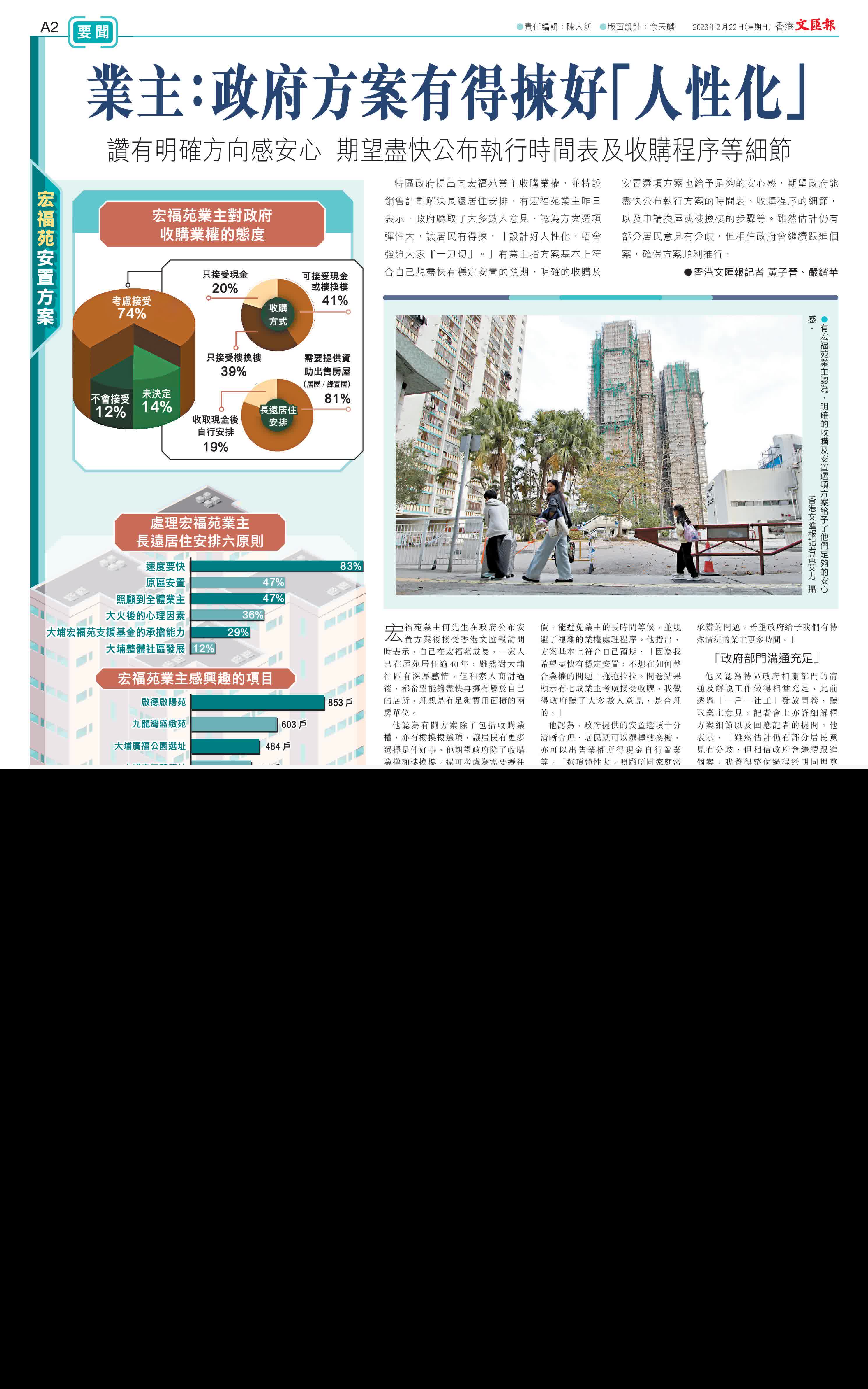 (香港文匯報記者 李千尋)特區政府於早前透過「一戶一社工」接觸受影響宏福苑業主,了解他們對長遠安置方案的初步意願。宏福苑共1,984戶中有1,975戶業主提交意見,回覆率逾99%。政府昨日公布調查結果指,超過80%受訪業主表示希望盡快處理長遠居住安排,74%受訪業主表示會考慮接受政府收購業權,當中41%表示可接受以現金或樓換樓方式處理。