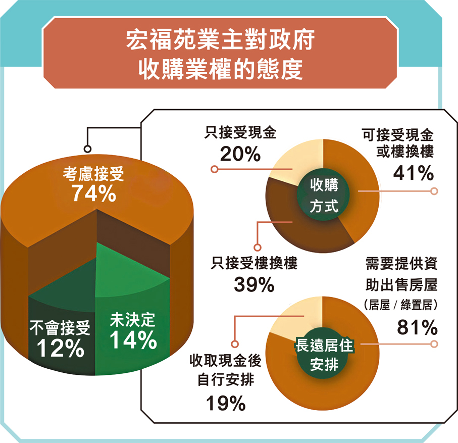 調查結果顯示,在考慮收購業權的1,458戶業主中,41%指可接受現金或樓換樓方式,39%接受樓換樓,20%接受現金收購。