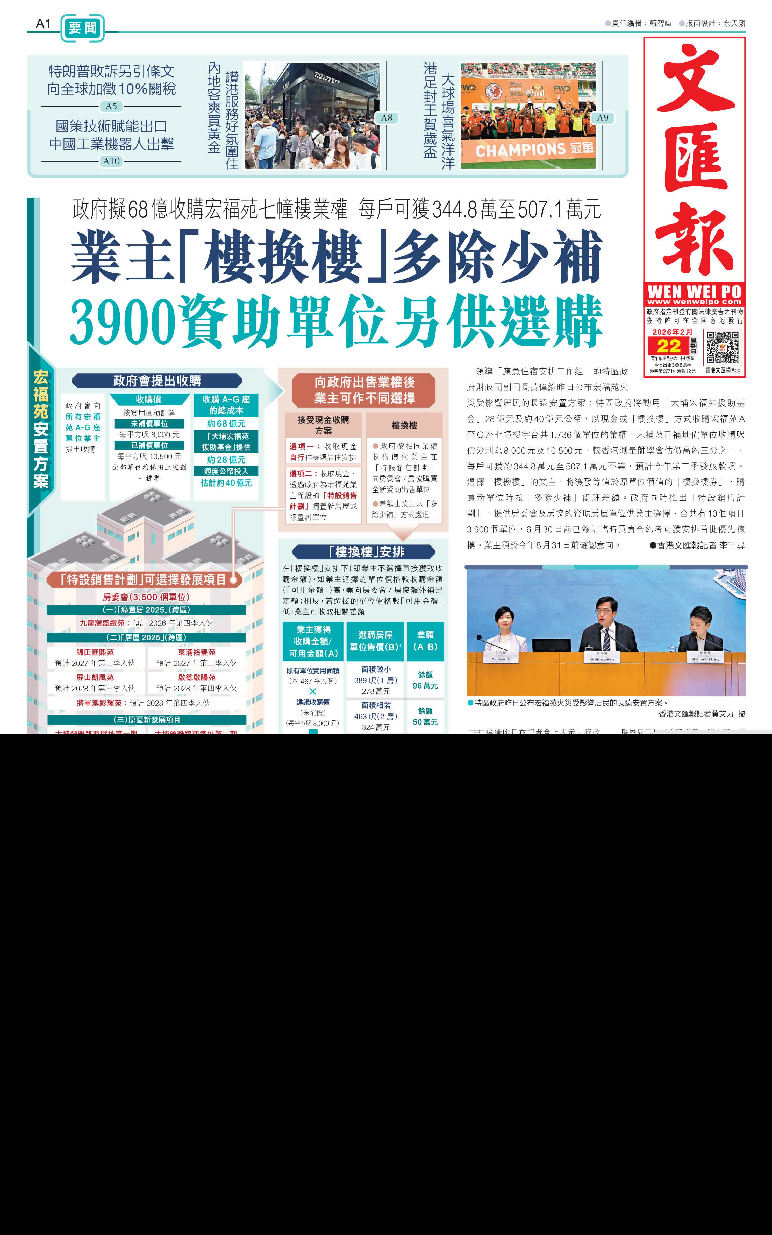 (香港文匯報記者 李千尋)領導「應急住宿安排工作組」的特區政府財政司副司長黃偉綸昨日公布宏福苑火災受影響居民的長遠安置方案:特區政府將動用「大埔宏福苑援助基金」28億元及約40億元公帑,以現金或「樓換樓」方式收購宏福苑A至G座七幢樓宇合共1,736個單位的業權,未補及已補地價單位收購呎價分別為8,000元及10,500元,較香港測量師學會估價高約三分之一,每戶可獲約344.8萬元至507.1萬元不等,預計今年第三季發放款項。選擇「樓換樓」的業主,將獲發等值於原單位價值的「樓換樓券」,購買新單位時按「多除少補」處理差額。政府同時推出「特設銷售計劃」,提供房委會及房協的資助房屋單位供業主選擇,合共有10個項目3,900個單位,6月30日前已簽訂臨時買賣合約者可獲安排首批優先揀樓。業主須於今年8月31日前確認意向。