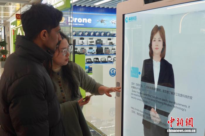 2月28日,浙江义乌,中外客商在店铺门前与多语种数字人对话。董易鑫 摄