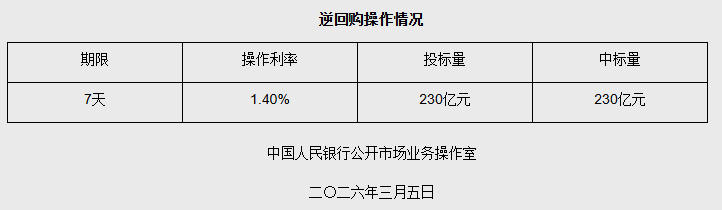 中国网3月5日讯 据央行网站消息,2026年3月5日中国人民银行以固定利率、数量招标方式开展了230亿元7天期逆回购操作。具体情况如下: