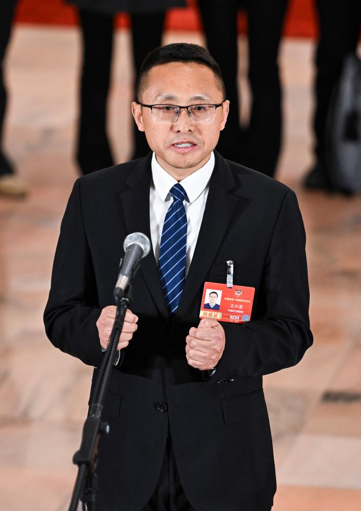 3月7日,全国政协十四届四次会议第二场“委员通道”集体采访活动在北京人民大会堂举行。这是全国政协委员王小龙接受媒体采访。新华社记者 曹祎铭 摄