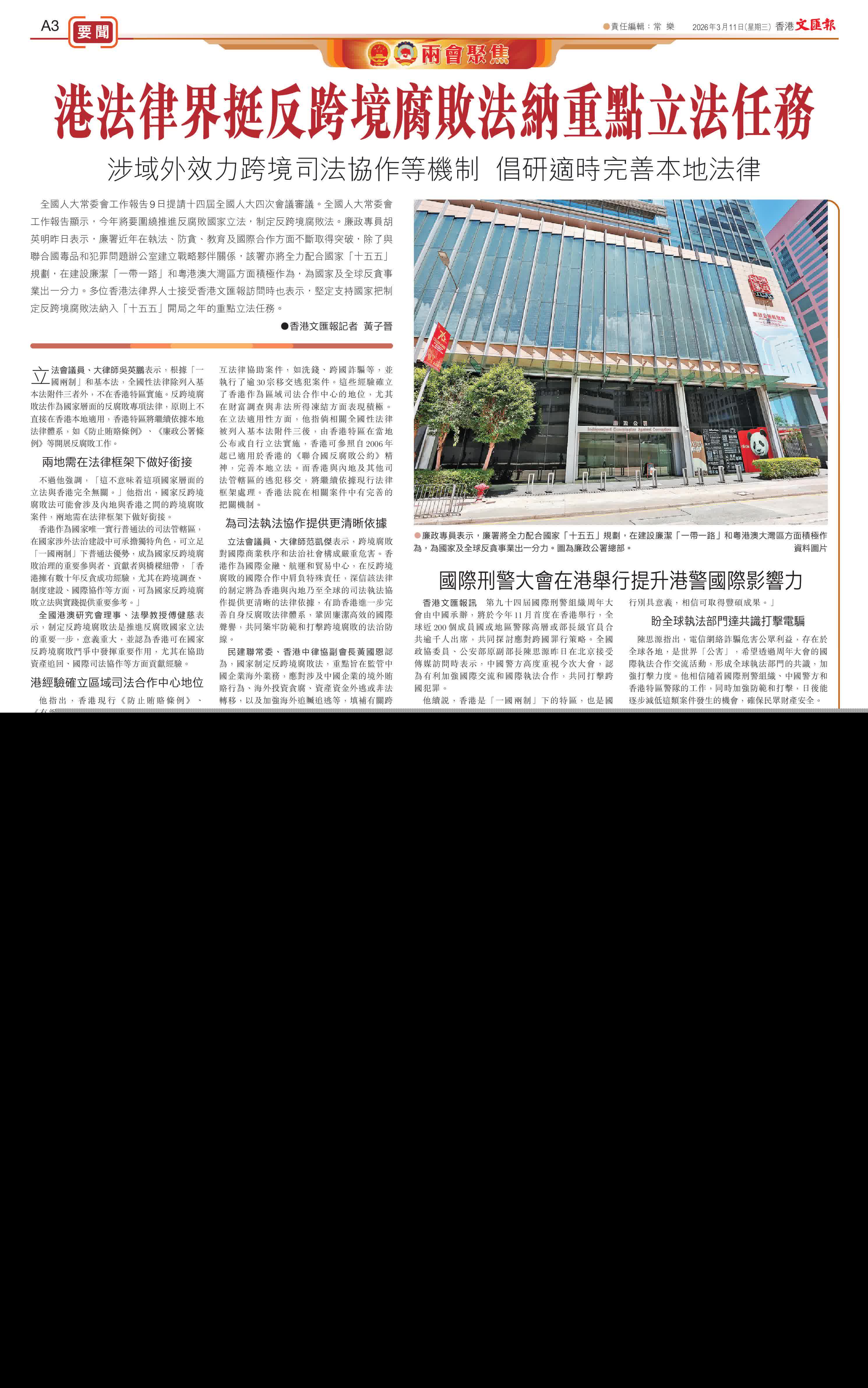 (香港文匯報記者 黃子晉)全國人大常委會工作報告9日提請十四屆全國人大四次會議審議。全國人大常委會工作報告顯示,今年將要圍繞推進反腐敗國家立法,制定反跨境腐敗法。廉政專員胡英明昨日表示,廉署近年在執法、防貪、教育及國際合作方面不斷取得突破,除了與聯合國毒品和犯罪問題辦公室建立戰略夥伴關係,該署亦將全力配合國家「十五五」規劃,在建設廉潔「一帶一路」和粵港澳大灣區方面積極作為,為國家及全球反貪事業出一分力。多位香港法律界人士接受香港文匯報訪問時也表示,堅定支持國家把制定反跨境腐敗法納入「十五五」開局之年的重點立法任務。