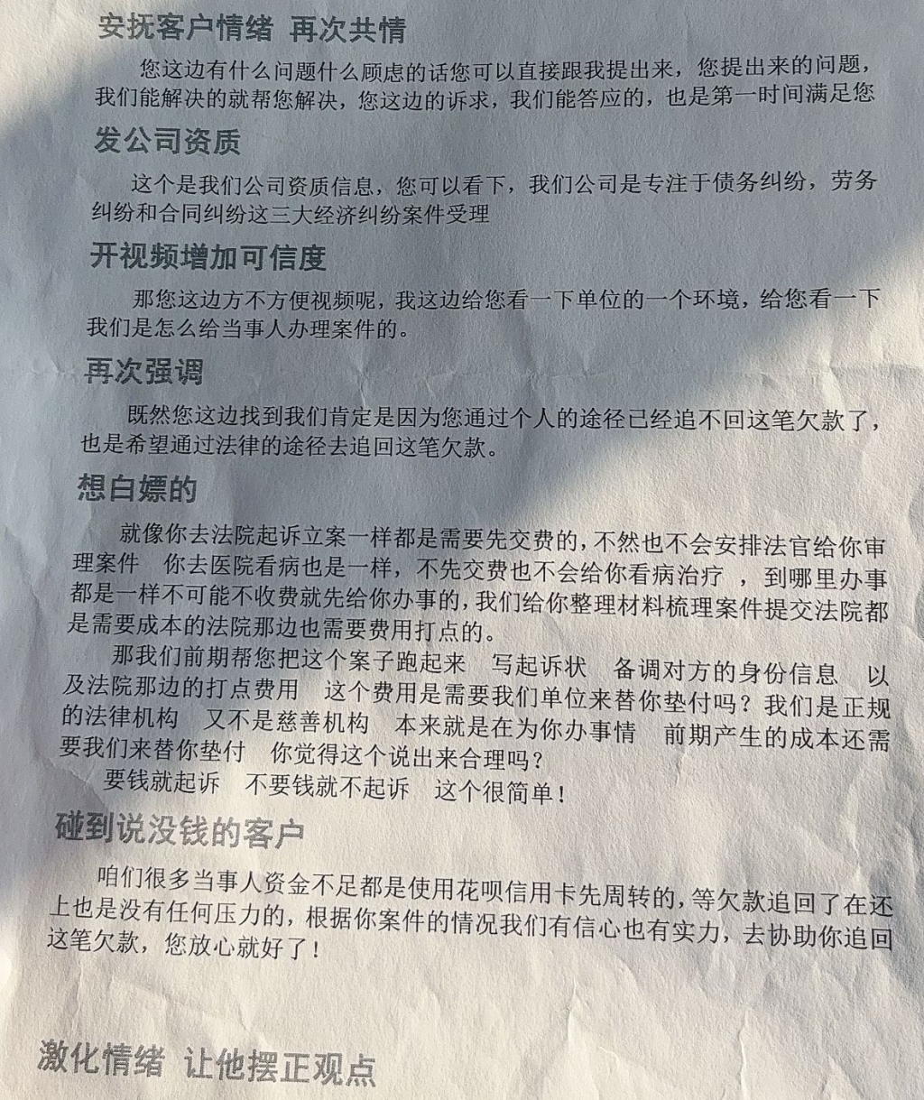 当你刷着短视频,浏览着网页,以为找到了靠谱的律师,结果,对面可能是一名拿着“话术本”不断诱导你交钱的营销人员。