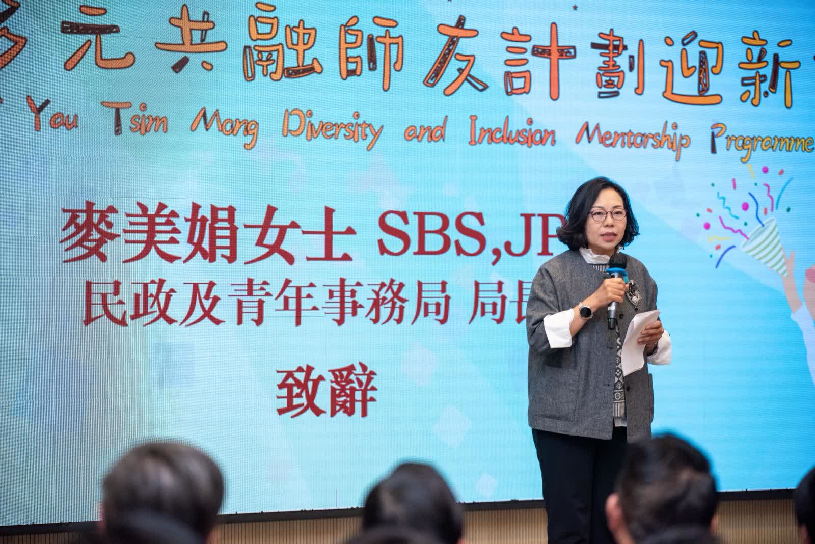 民政及青年事務局局長麥美娟致辭表示,見證着師友計劃不斷進步,日益完善,師友彼此交流學習、砥礪成長。她感謝主辦方油尖旺區關愛隊促進社區共融,亦感謝所有義務導師,樂見關愛隊成員兼任導師,為構建關愛共融的社區貢獻一分力 ,期望所有學員將所學融入生活,發揮潛能貢獻社會,亦與導師建立深厚情誼,互勉前行。