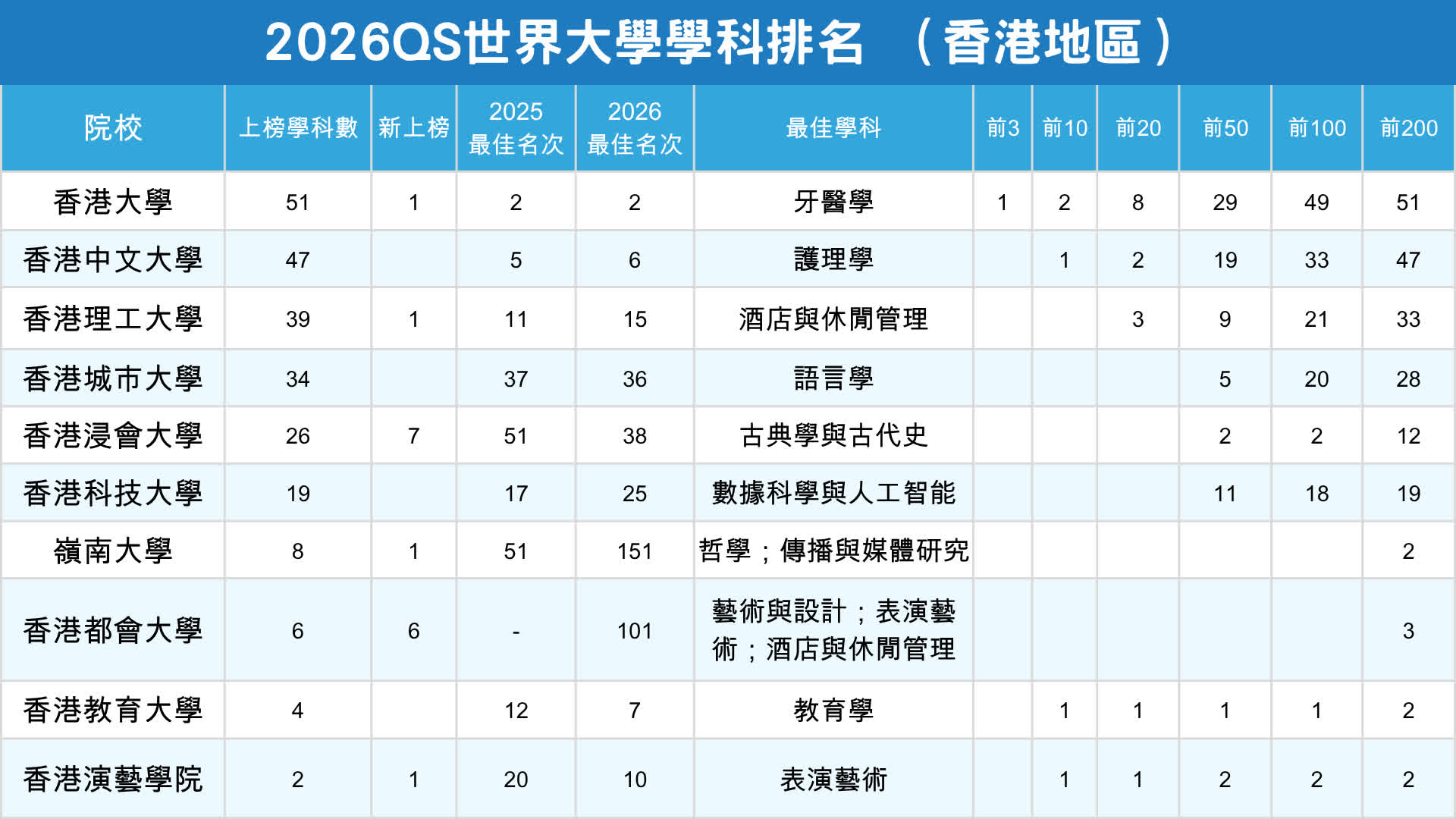 香港文匯報訊(記者 莫楠)特區政府近年積極鞏固香港國際教育樞紐的地位,本港專上院校在國際排名屢創佳績。國際高等教育機構QS今日公布2026年世界大學學科排名,香港整體表現亮眼:僅以10所上榜院校,即有5個學科打入全球前十,另有83個學科躋身全球前五十,成為區域內「高表現學科密度」最集中地區之一,成績之突出,為不少規模更龐大的高教體系所難以企及。全球前十學科分布於多所院校,包括香港大學、香港中文大學、旗艦學科排名升至第七的香港教育大學,以及首次打入前十的香港演藝學院,反映香港高等教育體系多元並進、百花齊放。