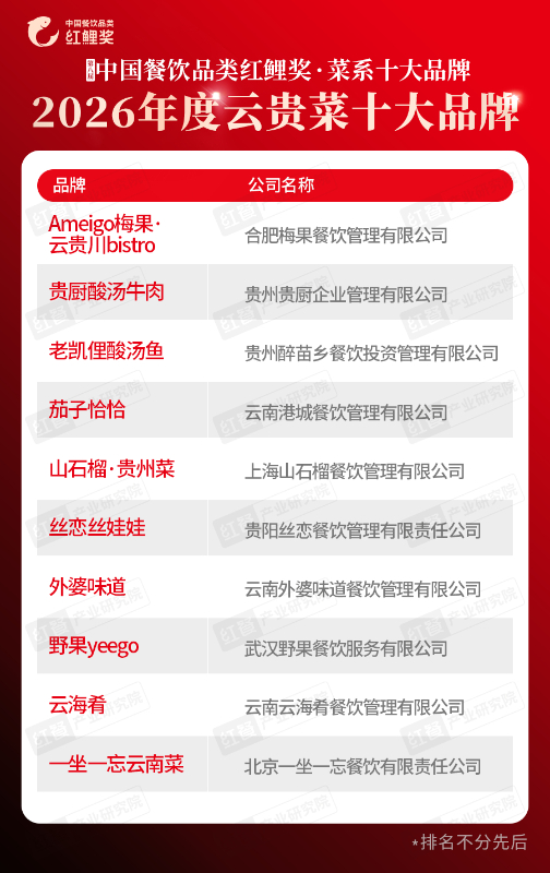 在“2026年度云贵菜十大品牌”榜单中,上榜品牌有Ameigo梅果・云贵川bistro、贵厨酸汤牛肉、老凯俚酸汤鱼、茄子恰恰、山石榴・贵州菜、丝恋丝娃娃、外婆味道、野果yeego、云海肴、一坐一忘云南菜。这些上榜品牌依托旅游流量、年轻消费、食材特色和标准化能力,不断夯实品牌根基,走进大众视野。