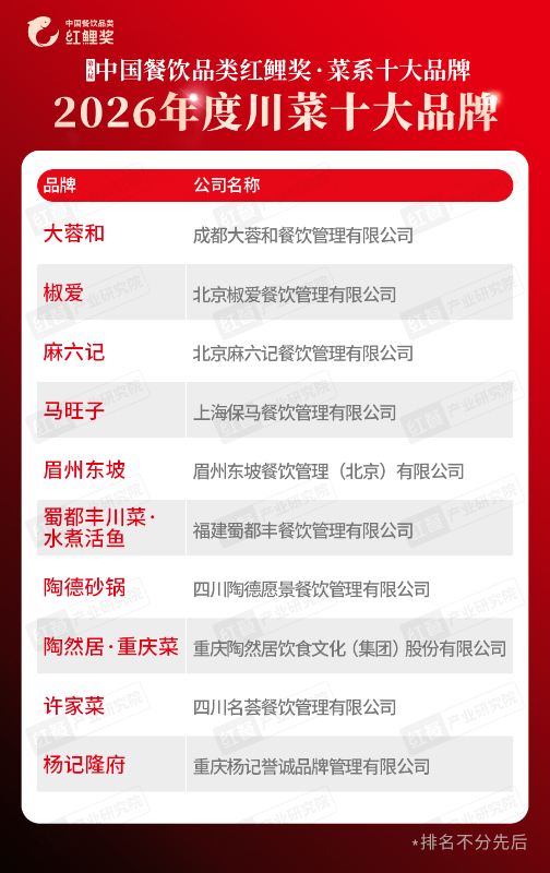 在“2026年度川菜十大品牌”榜单中,上榜品牌有大蓉和、椒爱、麻六记、马旺子、眉州东坡、蜀都丰川菜・水煮活鱼、陶德砂锅、陶然居・重庆菜、许家菜、杨记隆府。这些上榜品牌在轻量化副牌、数字化供应链、文旅融合等领域持续探索,推动川菜朝着标准化、连锁化、健康化、国际化方向稳步迈进,共同勾勒出当代川菜守正创新、多元并进的繁荣图景。