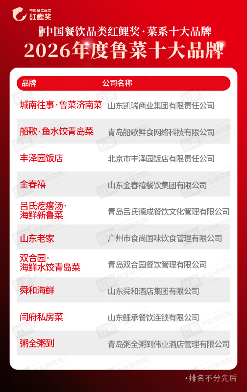 在“2026年度鲁菜十大品牌”榜单中,上榜品牌有城南往事・鲁菜济南菜、船歌・鱼水饺青岛菜、丰泽园饭店、金春禧、吕氏疙瘩汤・海鲜新鲁菜、山东老家、双合园・海鲜水饺青岛菜、舜和海鲜、闫府私房菜、粥全粥到。