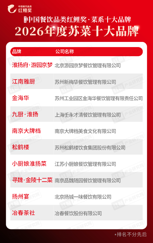 在“2026年度苏菜十大品牌”榜单中,上榜品牌有淮扬府・游园京梦、江南雅厨、金海华、九厨・淮扬、南京大牌档、松鹤楼、小厨娘淮扬菜、寻魏・金陵十二菜、扬州宴、冶春茶社。这些品牌在守正中创新,在传承中突破,均取得了不错的发展成果。
