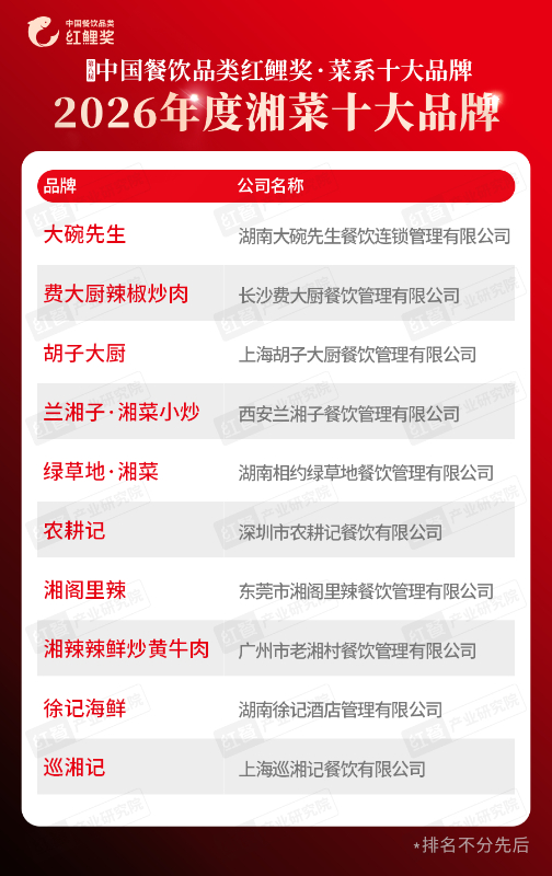 近年来,湘菜凭借鲜明浓郁的香辣风味、丰富多样的菜品类型以及源远流长的湖湘文化底蕴,在全国餐饮市场一路高歌猛进。在“2026年度湘菜十大品牌”榜单中,大碗先生、费大厨辣椒炒肉、胡子大厨、兰湘子・湘菜小炒、绿草地・湘菜、农耕记、湘阁里辣、湘辣辣鲜炒黄牛肉、徐记海鲜、巡湘记成功上榜。