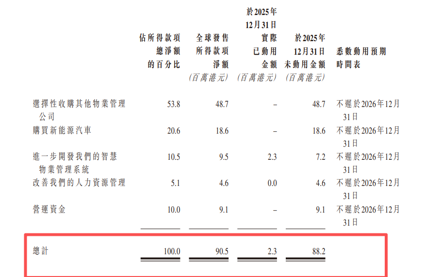 上市募集资金使用方面,公司全球发售所得款项净额约9050万元。截至2025年末,公司仅动用约230万元用于智慧物业管理系统,其余用途资金均未启用,未动用资金占募集资金总额约97.5%,募集资金全数动用预期时间表为不迟于2026年末。