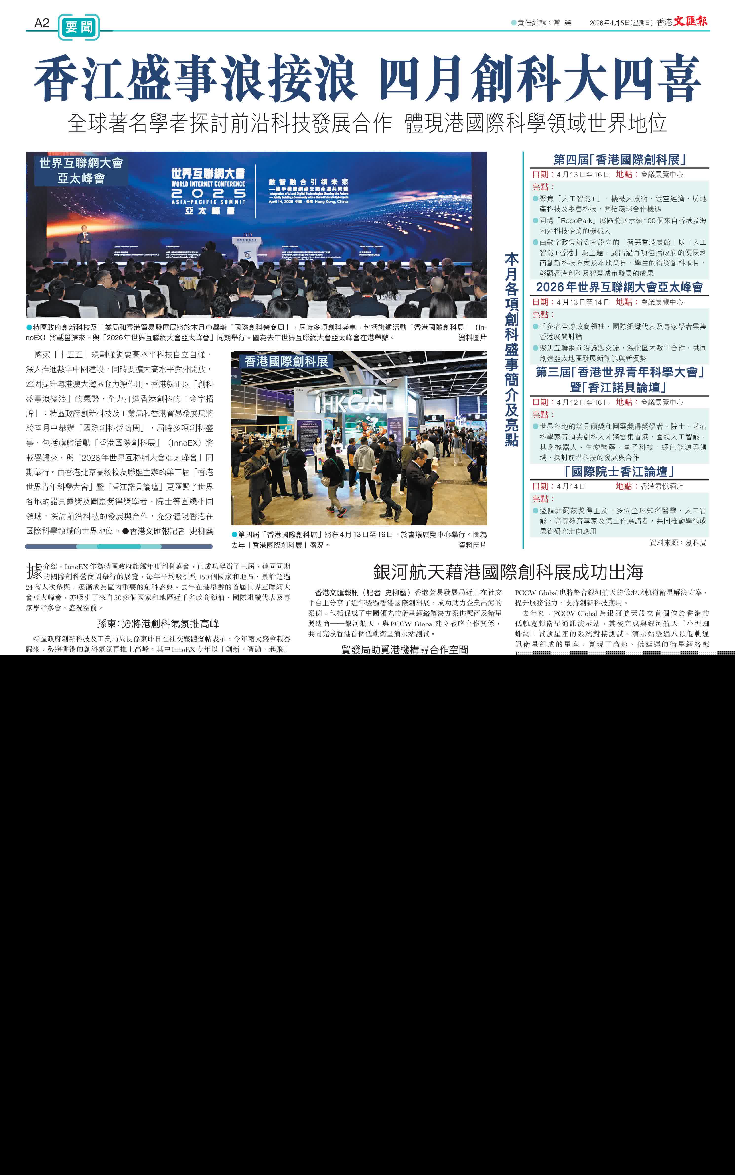 (香港文匯報記者 史柳藝)國家「十五五」規劃強調要高水平科技自立自強,深入推進數字中國建設,同時要擴大高水平對外開放,鞏固提升粵港澳大灣區動力源作用。香港就正以「創科盛事浪接浪」的氣勢,全力打造香港創科的「金字招牌」:特區政府創新科技及工業局和香港貿易發展局將於本月中舉辦「國際創科營商周」,屆時多項創科盛事,包括旗艦活動「香港國際創科展」(InnoEX)將載譽歸來,與「2026年世界互聯網大會亞太峰會」同期舉行。由香港北京高校校友聯盟主辦的第三屆「香港世界青年科學大會」暨「香江諾貝論壇」更匯聚了世界各地的諾貝爾獎及圖靈獎得獎學者、院士等圍繞不同領域,探討前沿科技的發展與合作,充分體現香港在國際科學領域的世界地位。