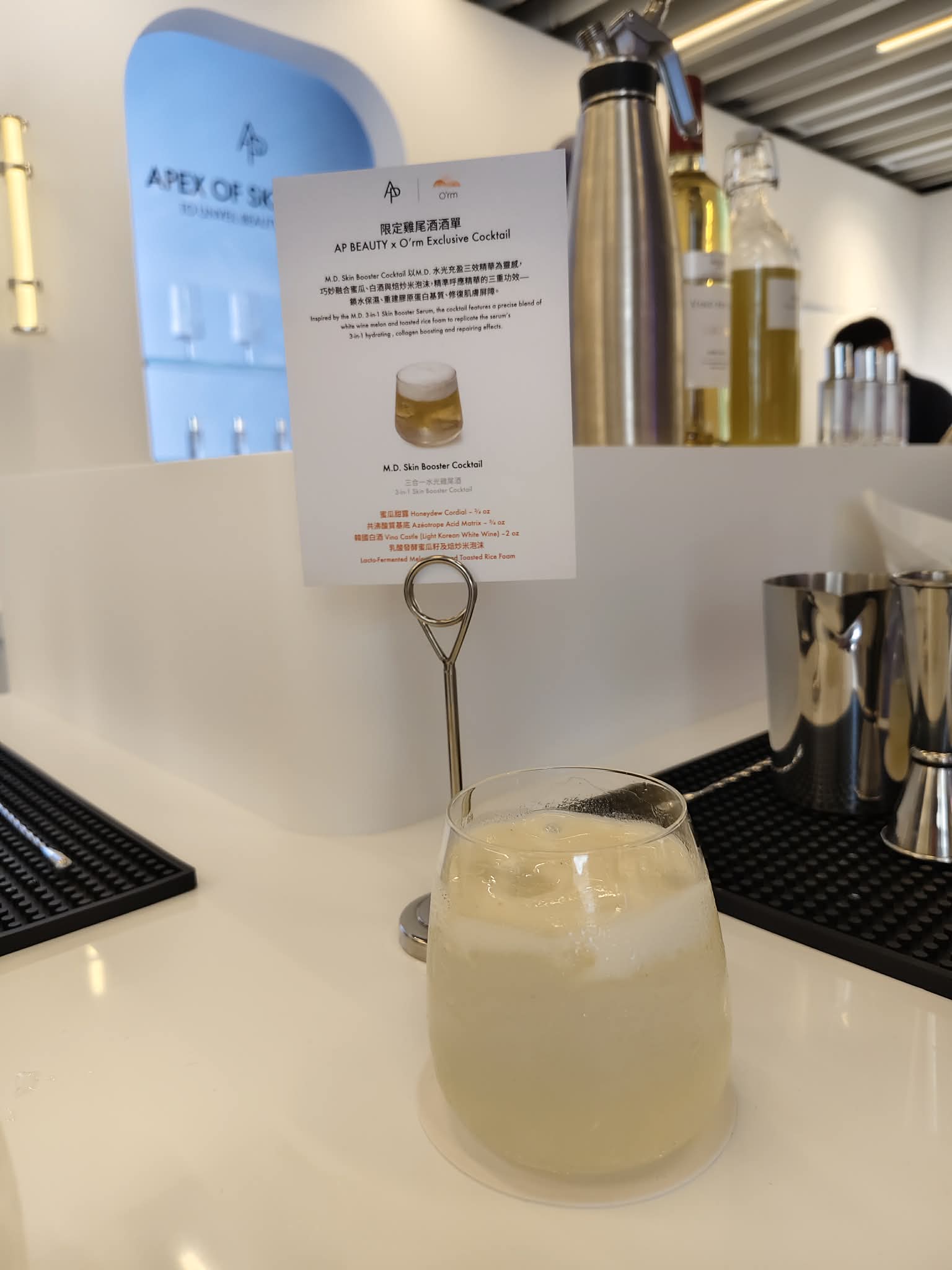 M.D. Skin Booster Cocktail以韓國白酒Vino Castle為基調,混合蜜瓜糖漿和添加乳酸發酵蜜瓜籽及焙炒米泡沫而成,整杯雞尾酒的設計概念呼應M.D. 水光充盈三效精華的功效:長效鎖水保濕、屏障修復再生及提升肌膚緊緻度。蜜瓜糖漿的含水量豐富,當中的果糖是皮膚天然保濕因子,負責維持角質層的含水量,能夠同時提供及鎖住水分。雞尾酒的表層泡沫由蜜瓜籽及焙炒米混合過濾而成。蜜瓜籽富含脂質與蛋白質,能夠激活植物的生長;經發酵產生的乳酸與益生菌成分,有助於平衡皮膚屏障。作為基底的Vino Castle韓國白酒富含多酚(如白藜蘆醇),能保護膠原蛋白免受氧化分解,如同M.D. 水光充盈三效精華的膠原成分,有效支撐強化肌膚的彈力結構。M.D. Skin Booster Cocktail味道清甜帶酸,連同泡沫一同喝下,口感絲滑輕盈,如同塗抹精華後肌膚即時獲得水分修復後的柔滑質感。