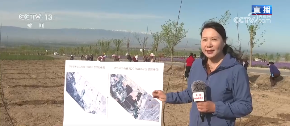2016年8月拍摄的卫星影像图与2025年8月拍摄的影像图对比后,明显看出绿色增加了、绿地更多了,植被覆盖率从23%提升到72%,区域降雨量增加了4到8毫米。现在已经种了2万多亩粮油作物、1.8万亩特色林果、2.2万亩观景花卉和世界上单体连片面积最大的薰衣草花田,以往寸草不生的荒芜之地如今变成了生机盎然的天山花海。