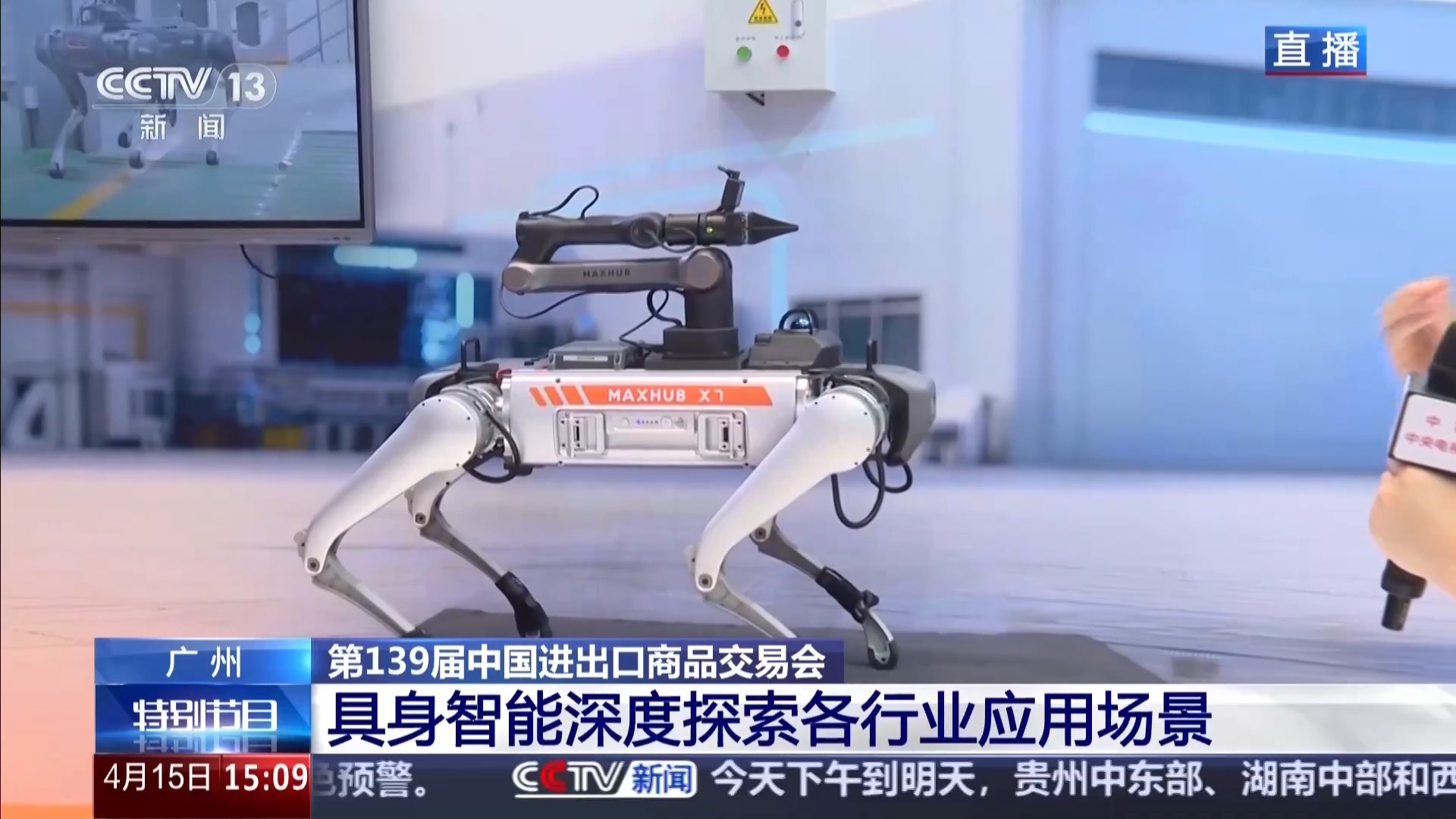 您看这个展位上,机器狗大家可能并不陌生,但是现在,机器狗可以搭载上机械臂,看起来科技感更足了,而且在你看不到的地方,其实这个机械臂背后也用上了最新的AI算法。这就让它可以在上台阶、走窄道的基础上,还能自主对电箱进行识别检修,解决了过去传统巡检机器狗“只能看、不能动手”的难点,从“巡检工”变成“检修工”。像这样搭积木式的组合、模块化的设计、AI的助力,从单一功能化身“多面手”,从陪伴到交互,这也是眼下中国机器人研发的新趋势。