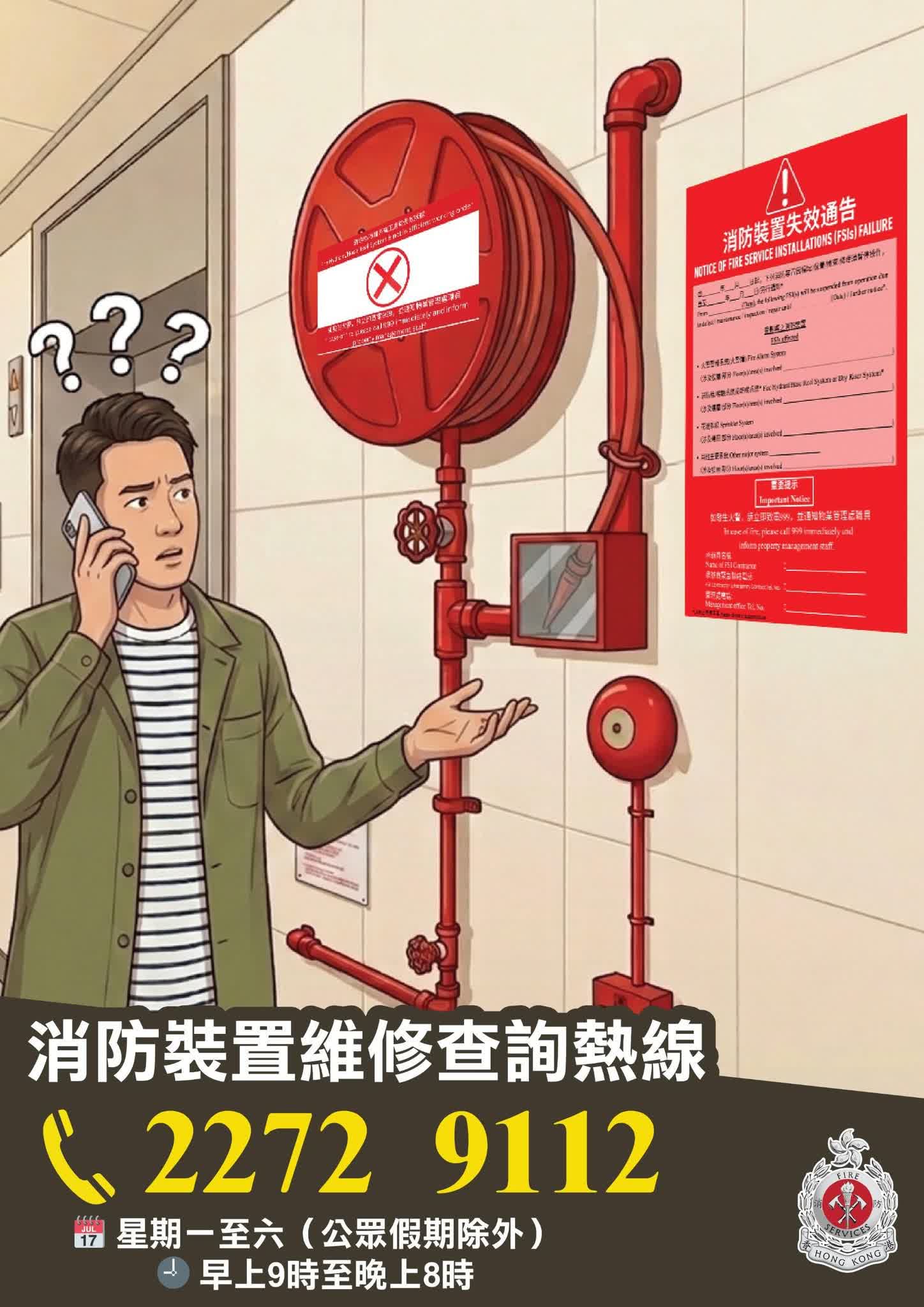 假如市民居住的大廈有火警鐘或消防喉轆等消防裝置,長期顯示為「維修」或「失效」,又或者對消防裝置承辦商的維修進度有疑問,均可以聯絡消防處。消防處希望與市民一起維護大廈的消防安全,守護市民的家園。