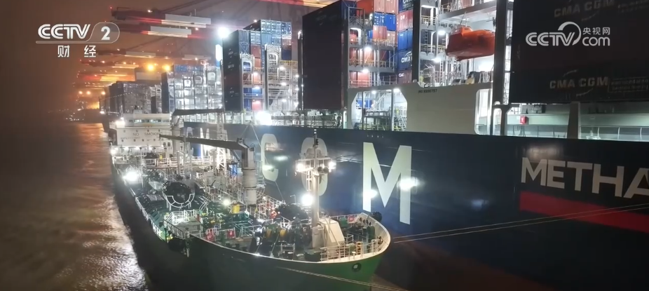 像这样的大型“访客”一直是洋山港的“常客”,港区内卡车穿梭不息、吊臂精准起落,这片海上“钢铁森林”每一分钟都在连接中国与世界。据了解,这里也是全球少数拥有LNG和甲醇加注功能的港口。2026年3月份,在洋山一期的3号泊位上,上港能源旗下甲醇加注船“海港致远”轮顺利完成对“达飞欧斯米姆”轮的国产绿色甲醇加注作业,加注量超3600吨,刷新了我国国产绿色甲醇单次加注量的最高纪录。上海口岸国产新能源汽车出口迎“开门红”