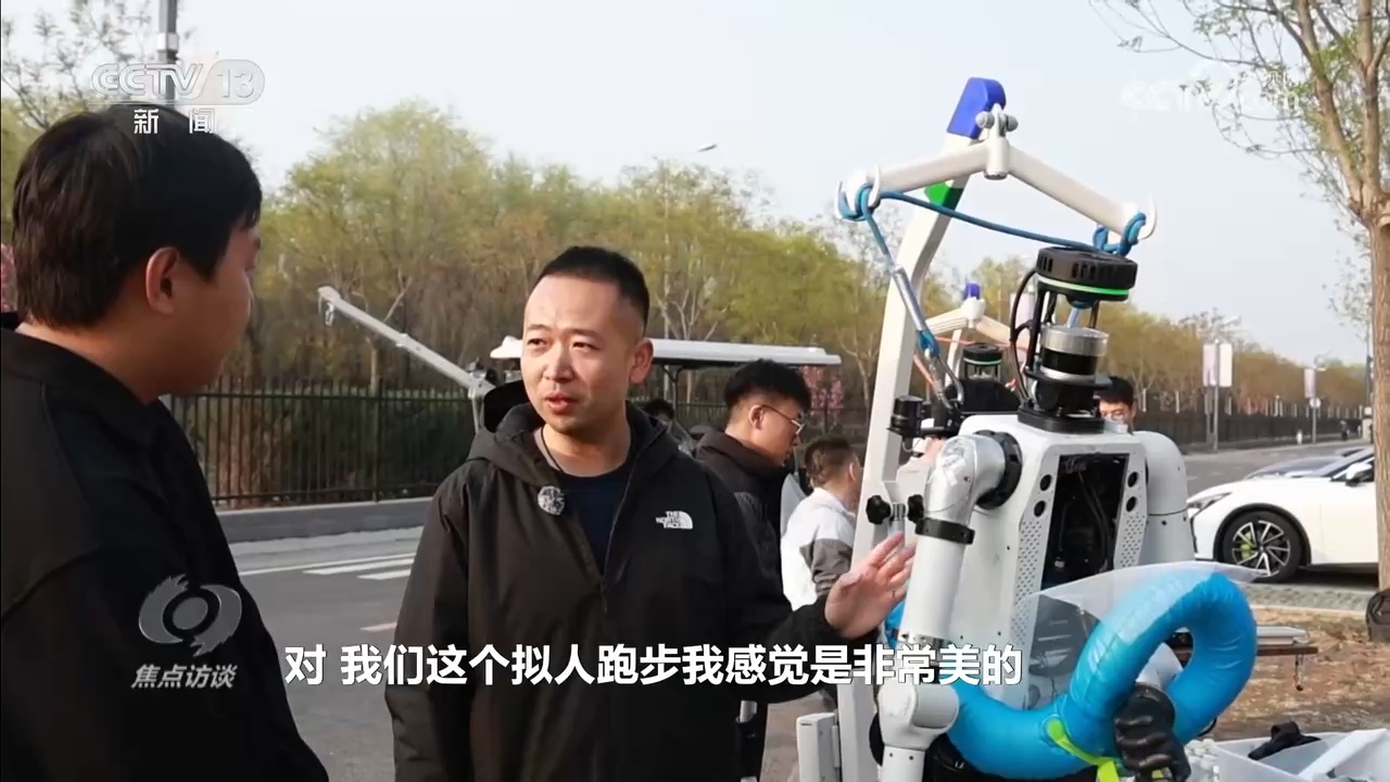 北京人形机器人创新中心自主跑工程师崔巍:“我们机器人的关节比去年更大、扭矩更长,在高速奔跑的情况下,尤其是21公里(的赛道长度),可能它的关节会发热,导致过热,所以我们做了液冷处理。”