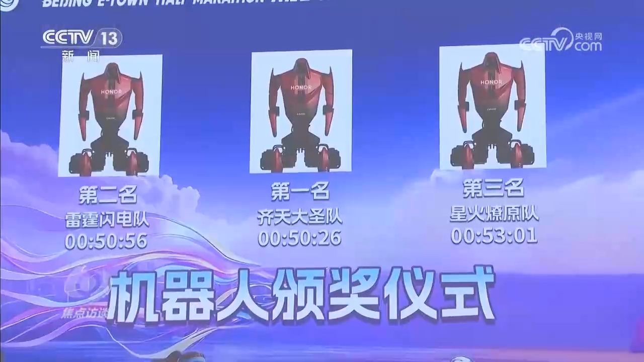 最后,来自荣耀的齐天大圣队、雷霆闪电队、星火燎原队分别获得冠军、亚军、季军,净用时分别为50分26秒、50分56秒、53分01秒,这个成绩甚至超越了乌干达名将基普利莫在今年3月刚刚创造的人类男子半马的世界纪录。