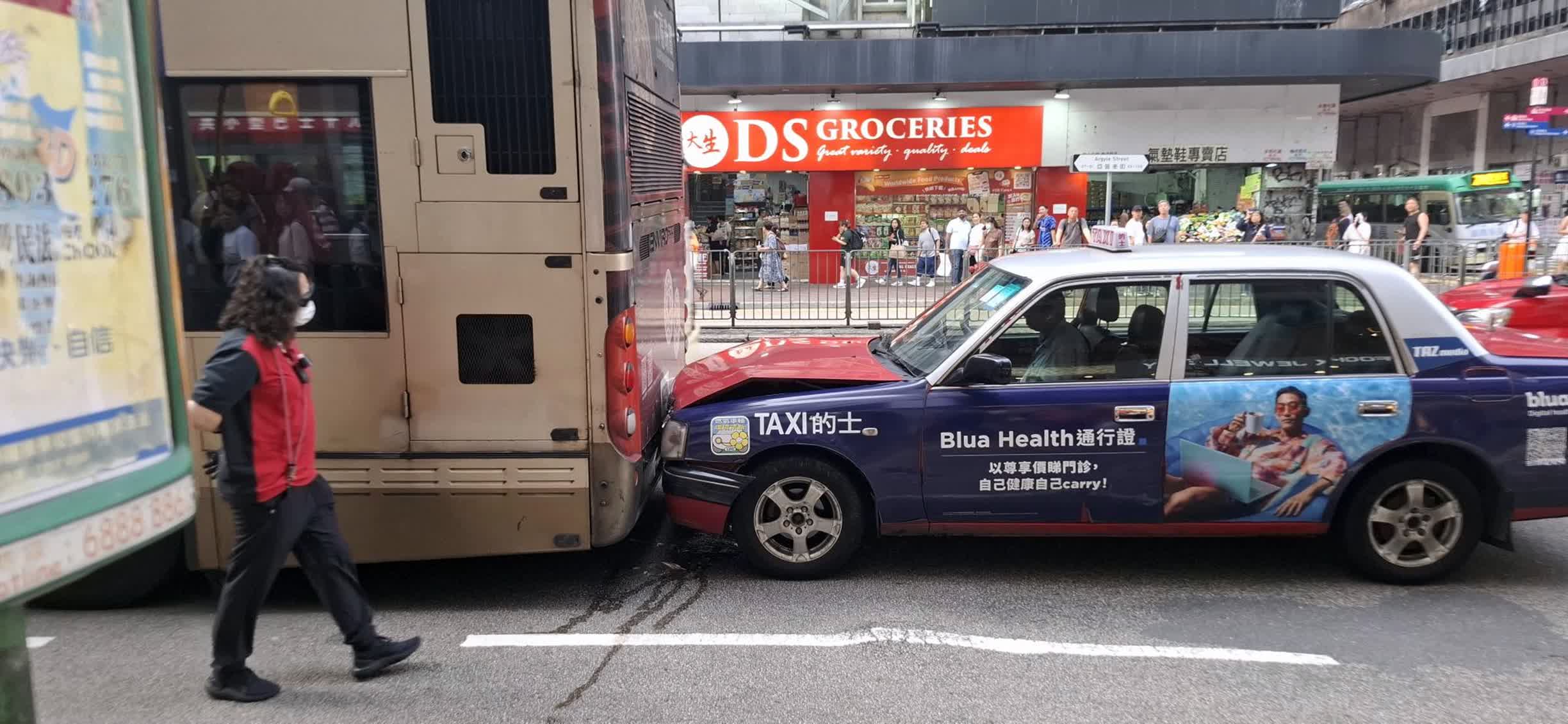 事發後警員到場調查,發現涉事受傷的姓林(72歲)的士司機身有酒氣,最終未能通過酒精呼氣測試,遂以涉嫌「酒後駕駛」將其拘捕,他其後被送往廣華醫院治療。至於被撞巴士上無人受傷,由網上圖片可見,撞車後兩車停在路中,九巴司機落車查看情況,而涉事的士司機則在車內受傷用手掩面。