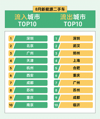 从城市来看,深圳、北京、广州、天津、杭州是新能源二手车流出量前5名城市,流入量前5名城市分别是深圳、武汉、郑州、上海、合肥。分析认为,目前一线、新一线城市充电配套体系更加完善,是新能源二手车主要流通标地。以榜首深圳为例,凭借新能源汽车产业先发优势,以及新能源车保有量高的特点,成为二手新能源车流通性最好城市。