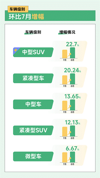8月虽然是汽车交易的淡季,但在细分类别中,大空间新能源二手车仍有较为突出的增长。瓜子二手车大数据显示,中型SUV、紧凑型车、紧凑型SUV是消费者购买新能源二手车的主流,而中型SUV涨幅最高,达到22.7%。