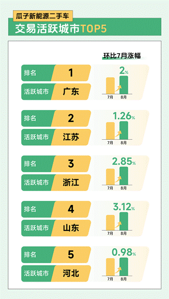 全国重点省份环比7月小幅增长,新能源二手市场回暖