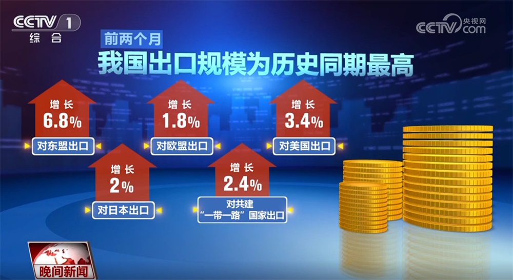 The General Administration of Customs announced on March 7 that according to customs statistics, my country's total import and export of goods was 6.54 trillion yuan in the first two months of this year. Among them, exports were 3.88 trillion yuan, an increase of 3.4%; imports were 2.66 trillion yuan, a decrease of 7.3%. In the first two months, my country's export scale was the highest in the same period in history. Among them, exports to ASEAN, the EU, the United States and Japan increased by 6.8%, 1.8%, 3.4%, and 2%, respectively, and exports to countries with jointly building the "Belt and Road" increased by 2.4%.
