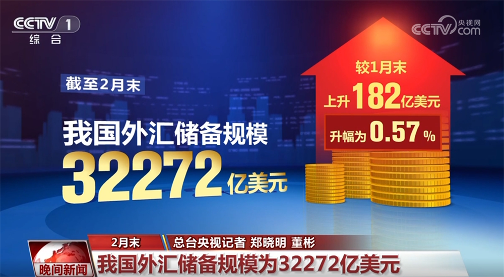 The latest data from the State Administration of Foreign Exchange shows that as of the end of February, my country's foreign exchange reserves were US$322.72 billion, an increase of US$18.2 billion from the end of January, an increase of 0.57%, and the scale of foreign exchange reserves remained basically stable.