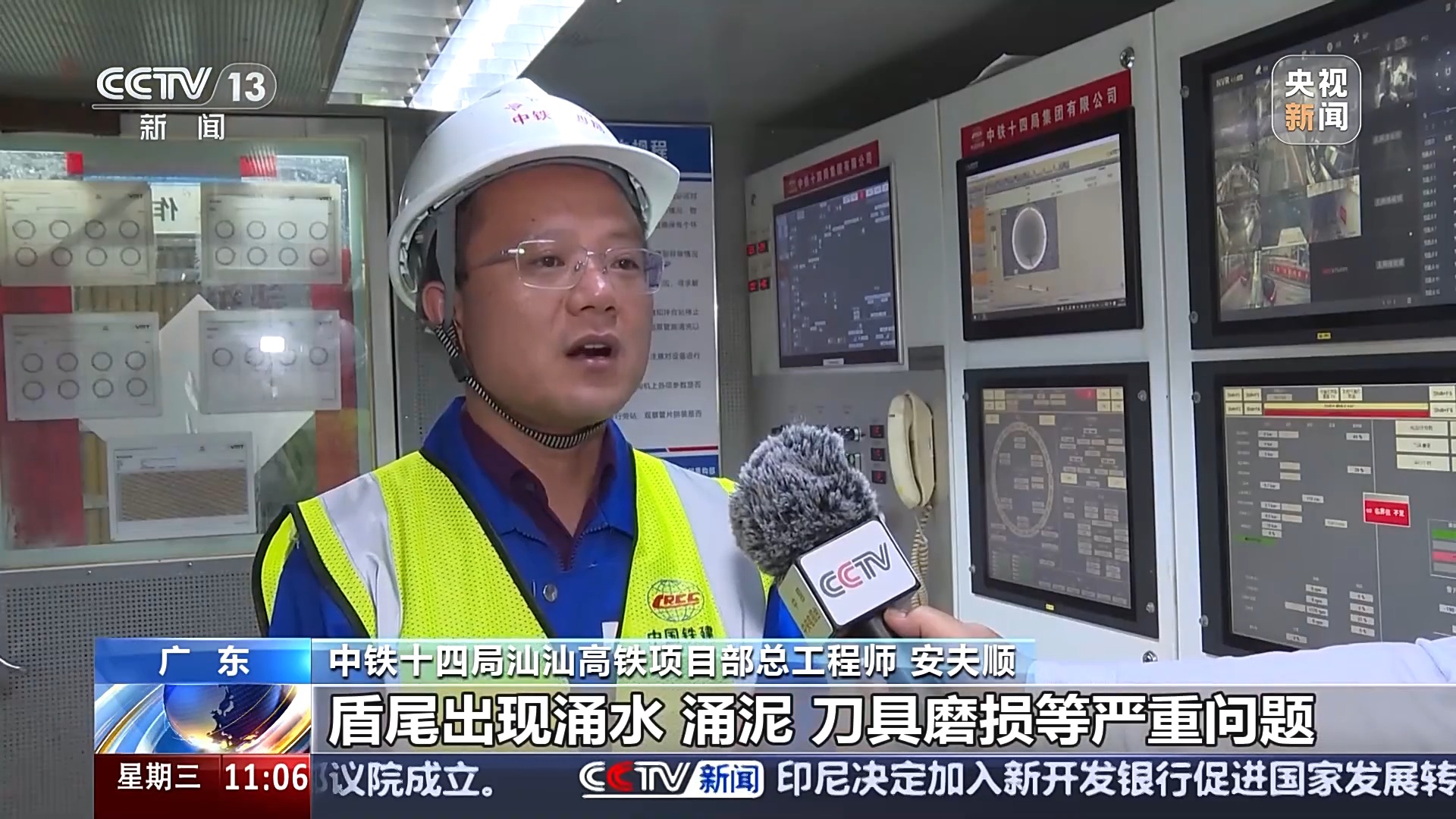 中铁十四局汕汕高铁项目部总工程师 安夫顺:在掘进过程中容易出现刀盘卡顿、盾尾出现涌水涌泥、刀具磨损等严重问题,而且需要海底频繁更换刀具甚至带压进仓作业。为此,我们首次创新采用刀间距为90毫米的常压刀盘,刀间距越小,刀具越多,常压刀盘里面就增强滚刀在硬岩地层中的破岩效率。