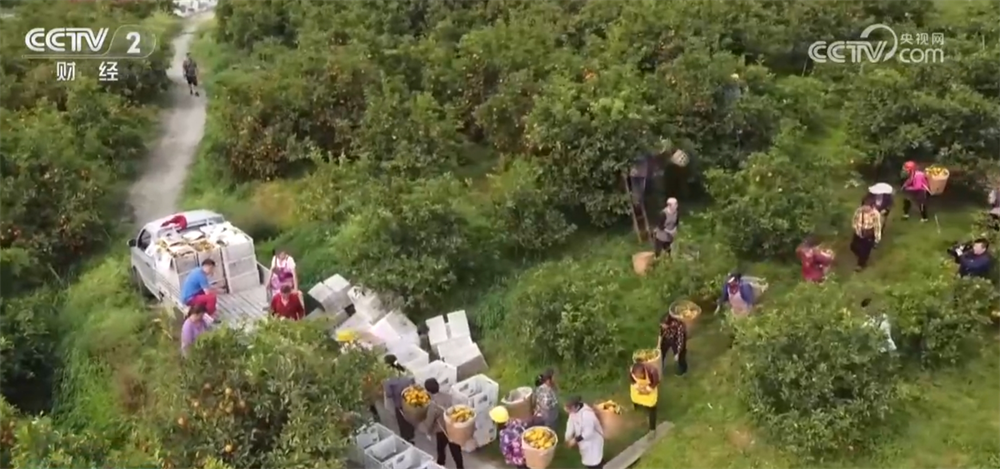 In the blood orange planting base, late-ripening blood oranges are full of fruits all over the mountains. Fruit farmers are busy picking, sorting and packing, and boxes of packed late-ripening blood oranges are quickly loaded and sent to various places.