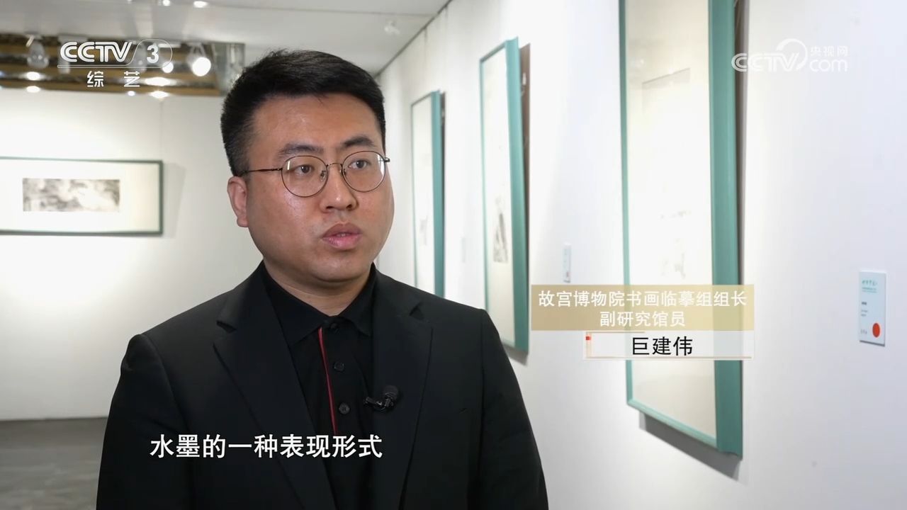 故宫博物院书画临摹组组长、副研究馆员 巨建伟:其实我的画面构建更多源于中国书画美学,更多地使用了单纯水墨的一种表现形式。这种黑和白,以及黑和白过渡的灰颜色的一种艺术形式,其实更像传统哲学里边的阴阳关系,我们通过阴阳的关系对立统一的存在,构建起来一个既有矛盾,但同时又能够统一存在的一种艺术状态。这种艺术状态是我在实际创作中或者说创作实践中所追求的。